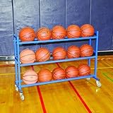 Introducing the "Atlas" Series from our Totemaster line. Constructed of thick wall 1" square steel tube. These units are rugged and strong enough for an assortment of medicine balls. Heavy duty non marking swivel casters for easy transport. Protective powder coating (blue) for longer life. This unit is lockable with customer supplied lock, and a hinged top. Will store up to 20 basketballs and up to 30 volleyballs. Stores up to 15 balls. Dimensions: 51.5" L x 18" W x 36" H.